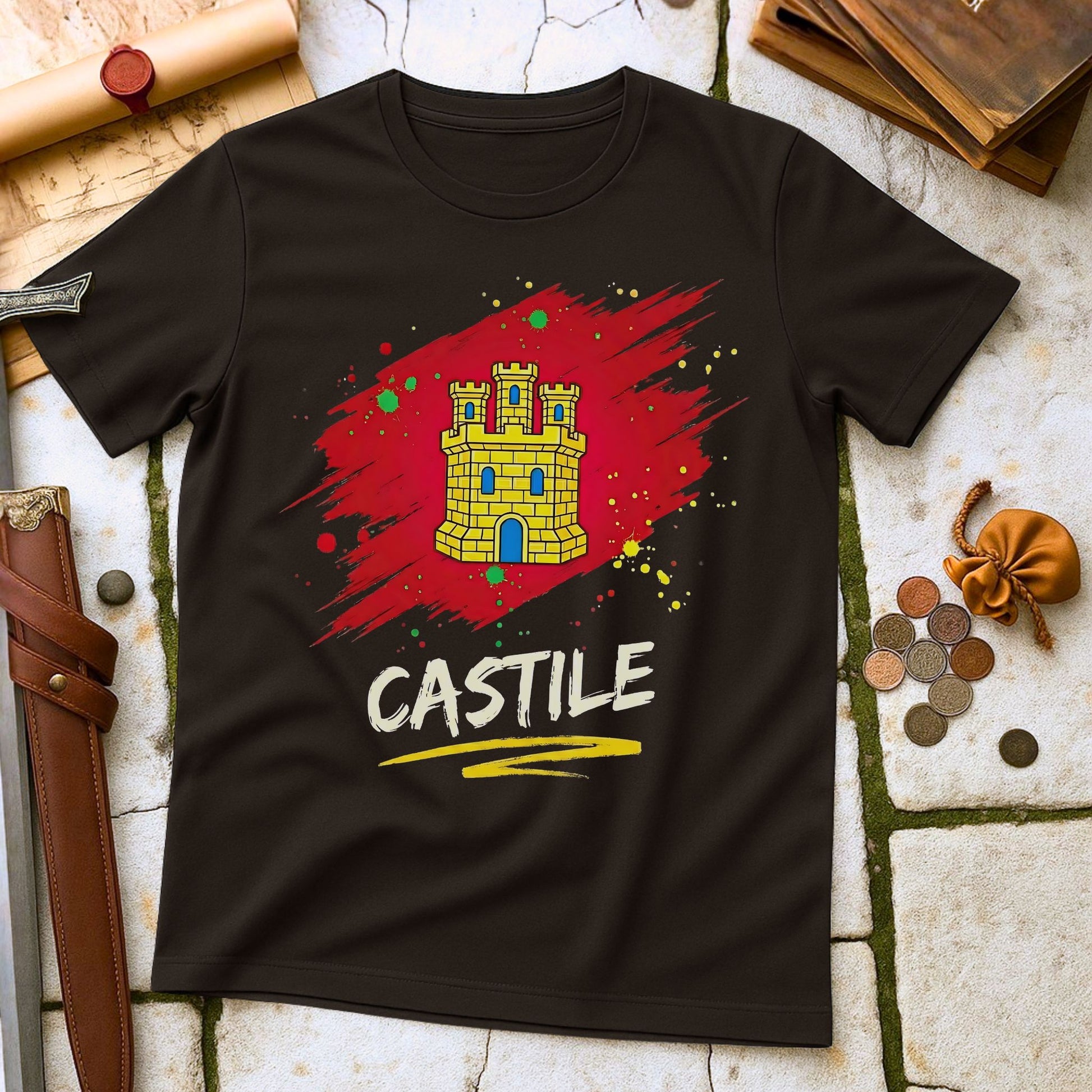 Declare your connection to the heartland of Spain with the official Castile Castle Heraldry T-Shirt. This design honors the legacy of the Medieval Kingdom of Castile, whose strategic strength and influence were central to the Reconquista and the unification of Spain.